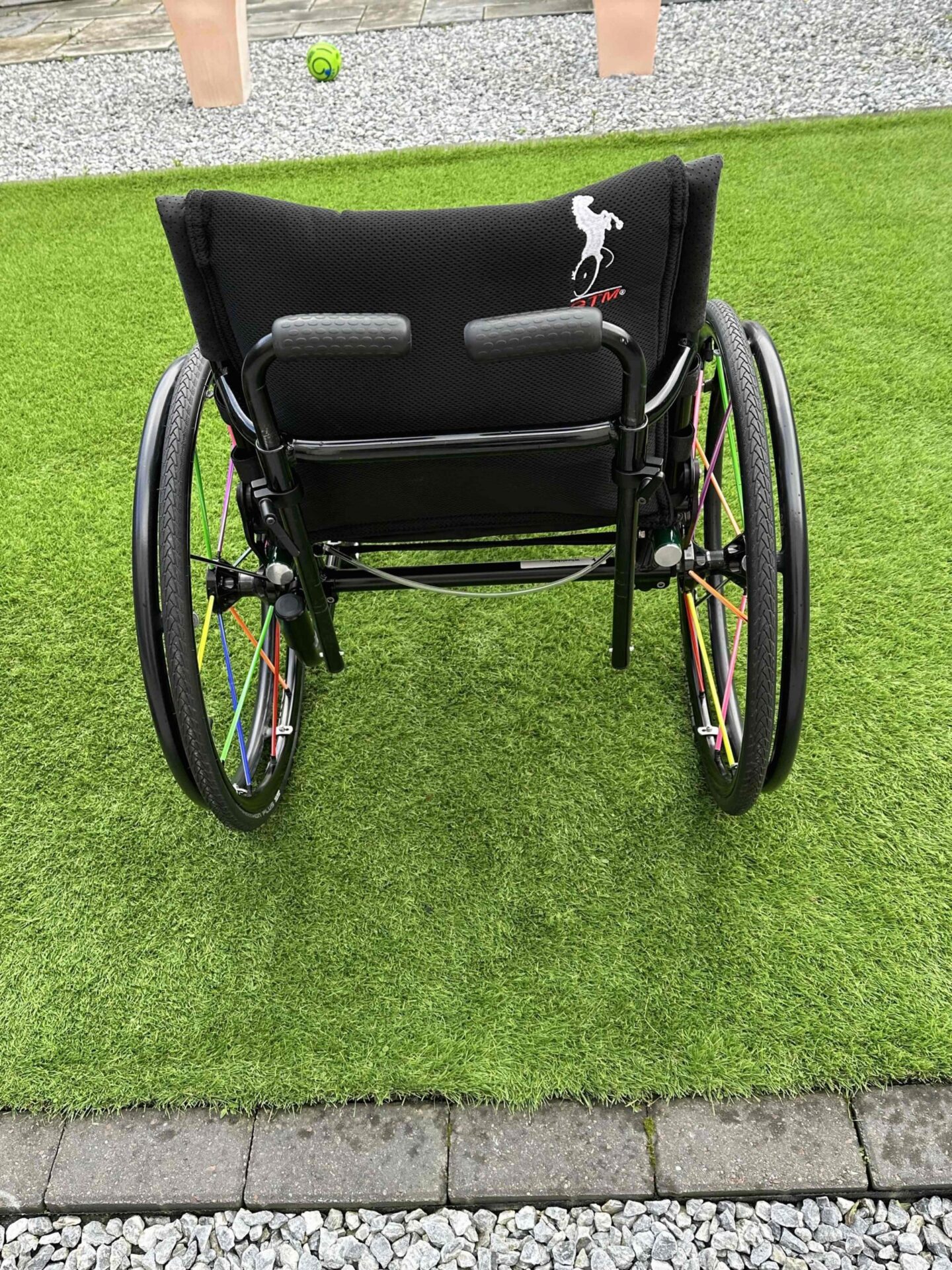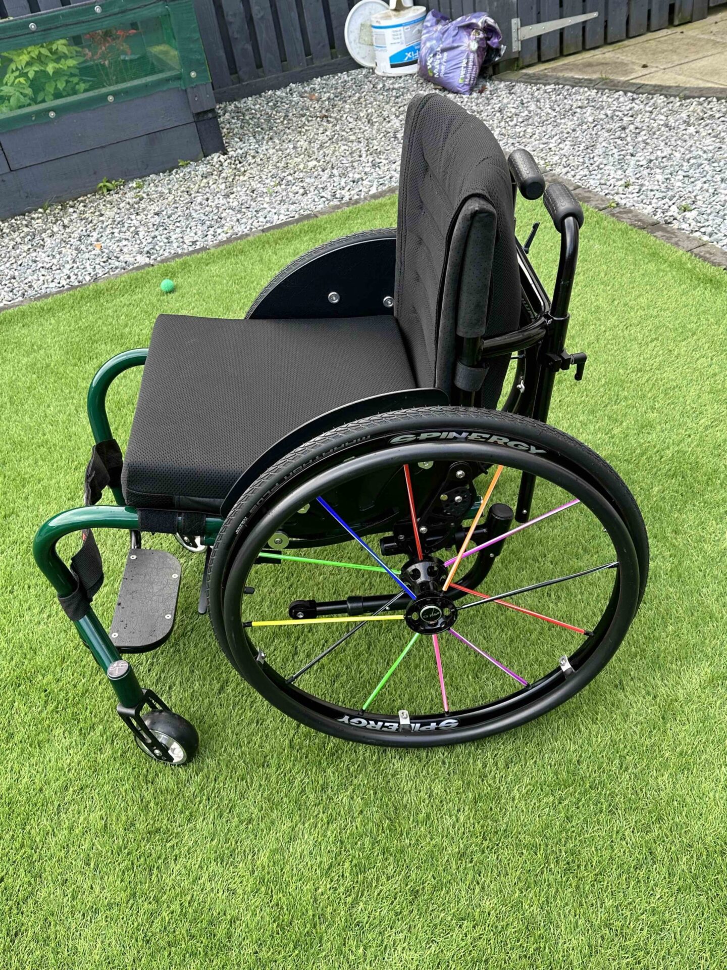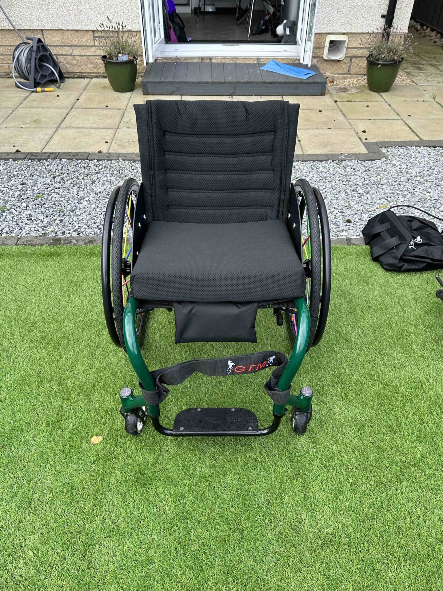 Manual wheelchair with a green, folding GTM Y-shape frame that is lightweight, durable, and highly customisable.