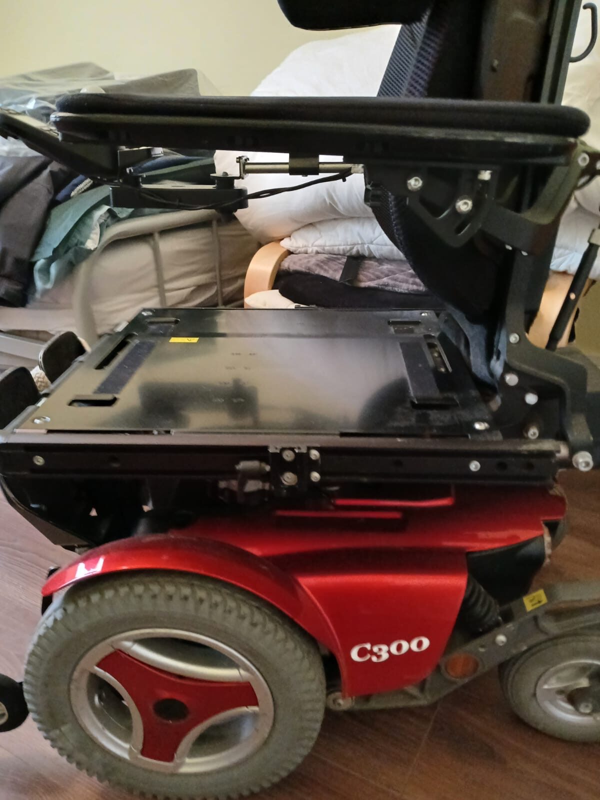 The Permobil C300 is red and in good condition. All functions are electric, and all work.