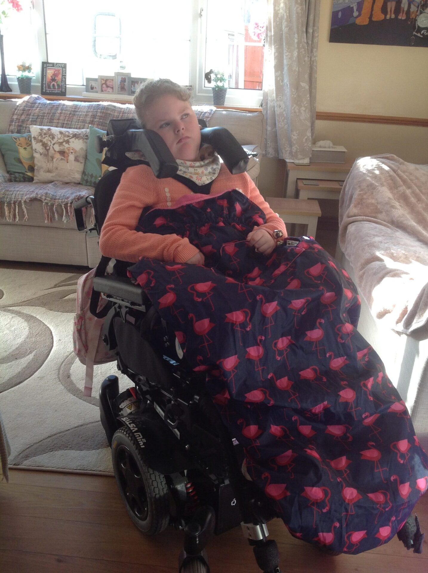 The drawbacks include that you cannot hang bags on it, but I can attach her suction machine since she needs it all the time. Also, I cannot find a waterproof hood that can be clipped on to protect her head from wind and rain. However, I love the Bundlebean Cosy, which is a flamingo fleece blanket with a waterproof lining. It covers the entire chair, which is brilliant.
