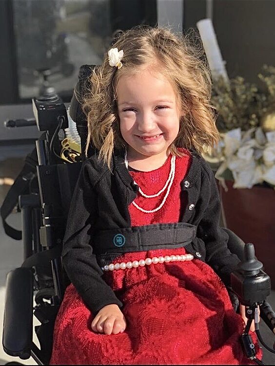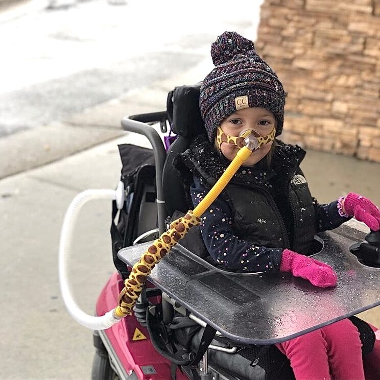 Photo of a young girl using a 'ROVI X3 Pediatric' powered wheelchair with custom-moulded backrest, while wearing an oxygen mask.