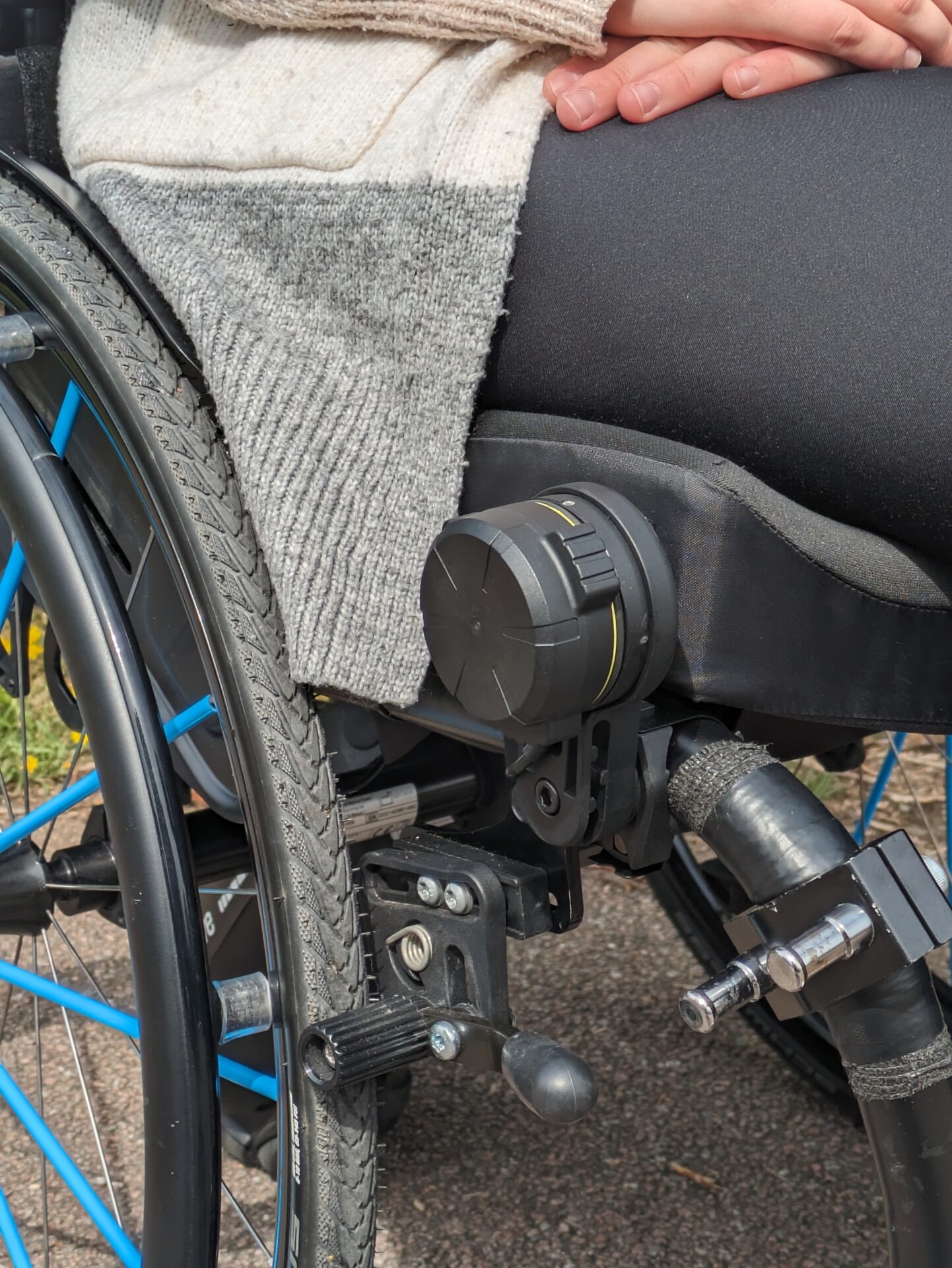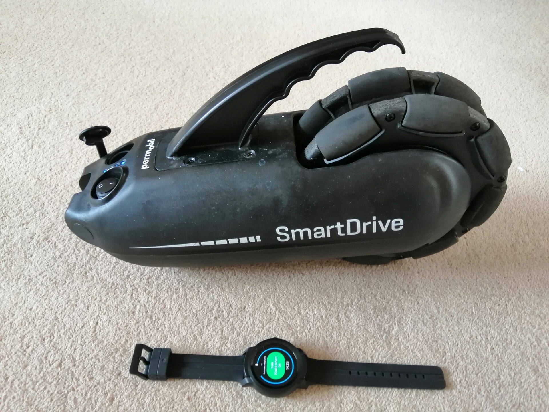 Update! Over the past few weeks, I have had the chance to trial the new SmartDrive SpeedControl Dial, and to put it simply, it is amazing. (Thanks so much to Pete from Nexus for this opportunity.) The dial attaches to the frame of my chair and connects to the main unit via a wire. This makes it much more reliable than the watch that operated via Bluetooth.