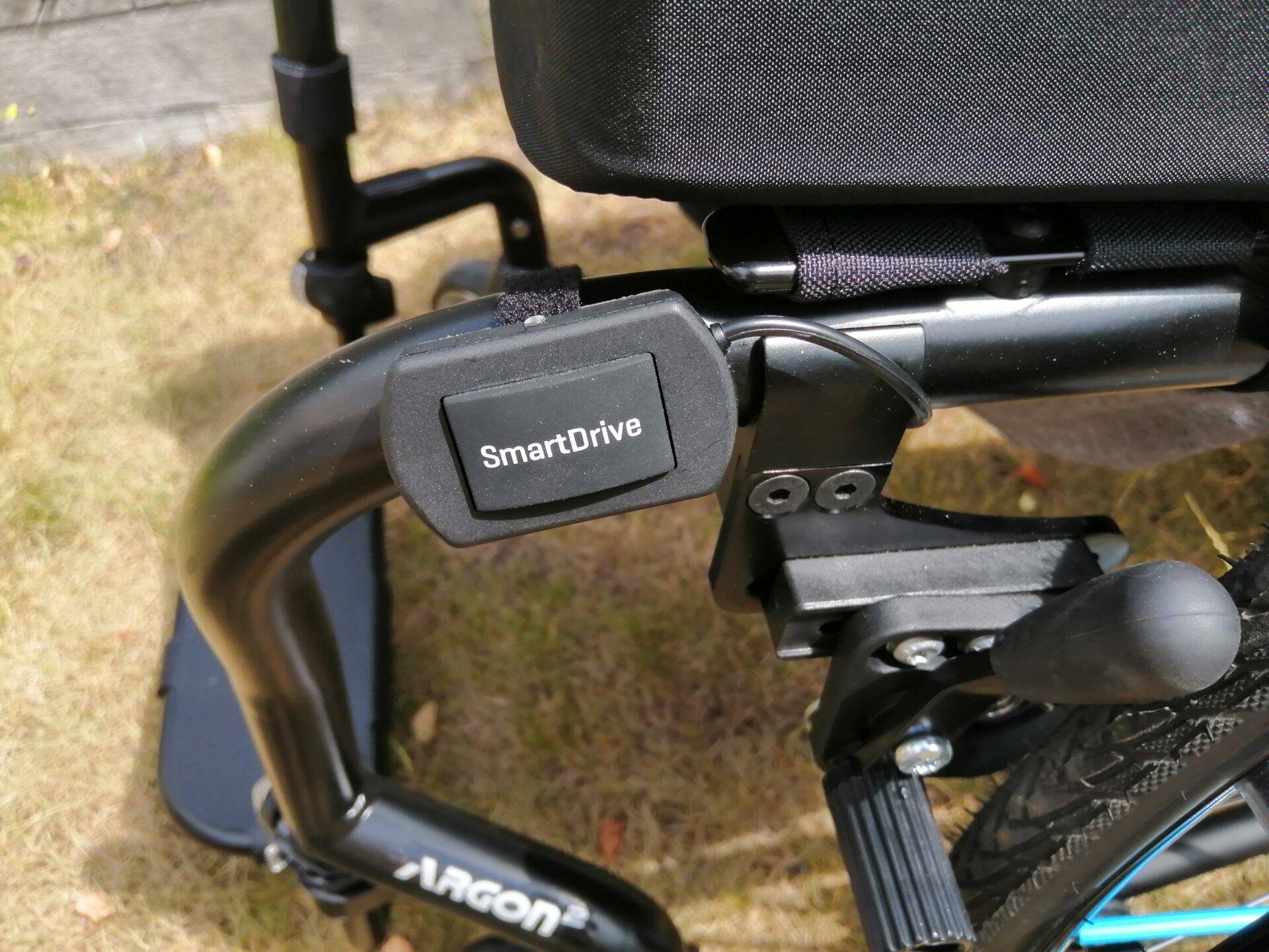 It attaches to the chair via a bracket mounted on the axle, which only took a few minutes to install. The main unit then hooks over this bracket. This can be tricky and requires crouching down until you get the hang of it. I have not been able to attach or detach it while sitting in my chair. Additionally, to lift the chair, such as up a few steps, you need to detach the SmartDrive; otherwise, it swings, which means I can find myself constantly detaching and reattaching it if I want to go into a series of inaccessible venues.