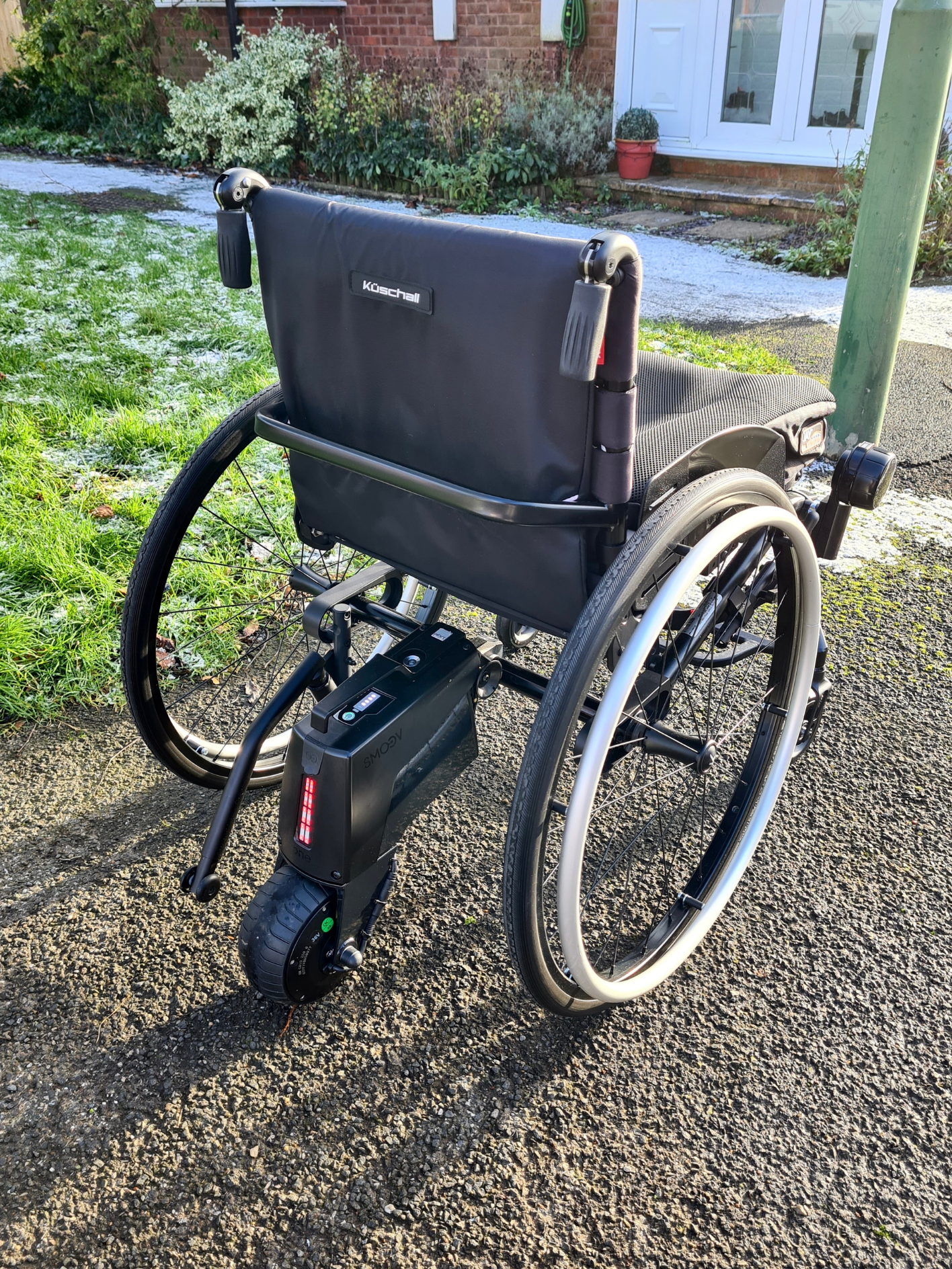 Power assisted device, Black box with swivelling wheel attached to the rear of manual chair.